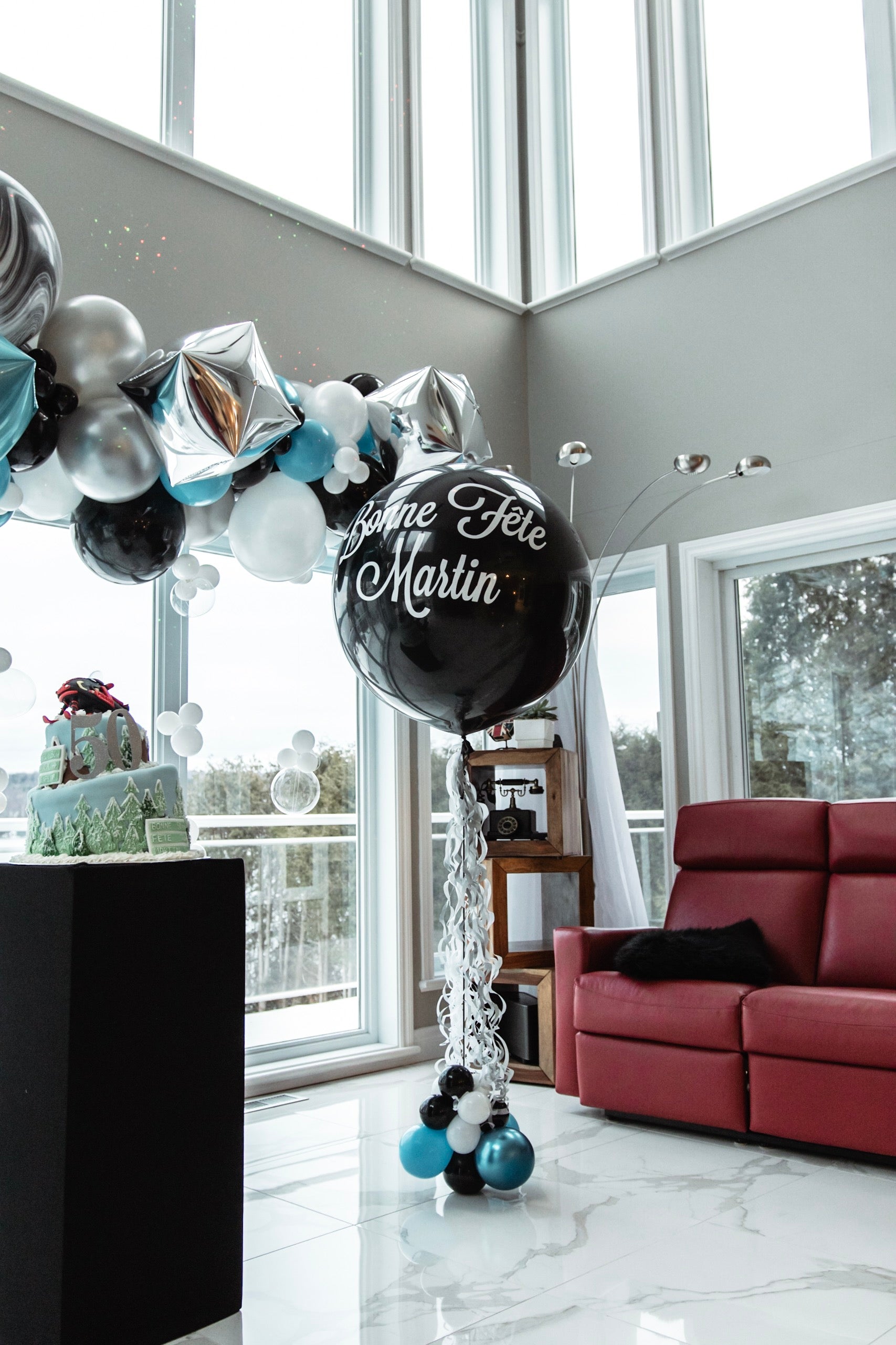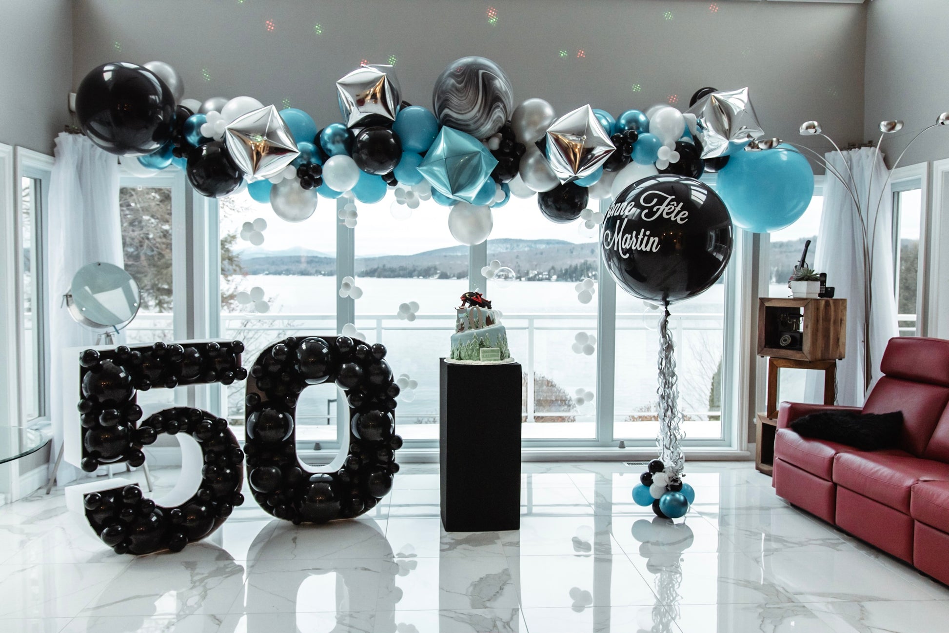 Un décor festif et hivernal imaginé pour célébrer les 50 ans de Martin. Inspiré du thème de la neige, chaque détail a été pensé pour recréer une ambiance élégante et originale.
