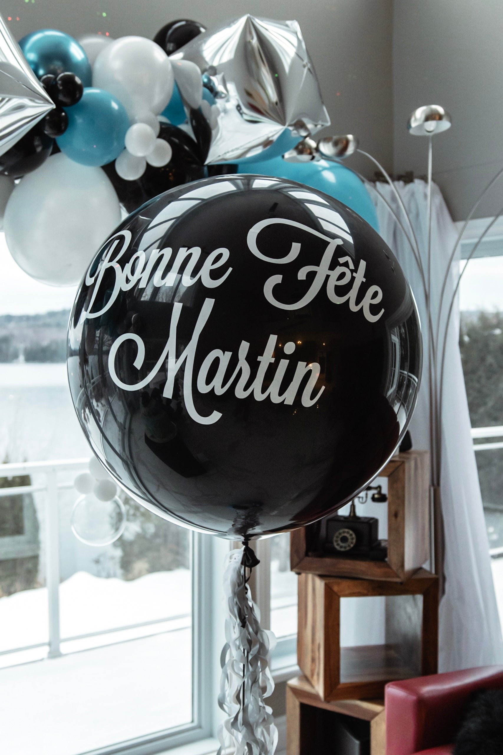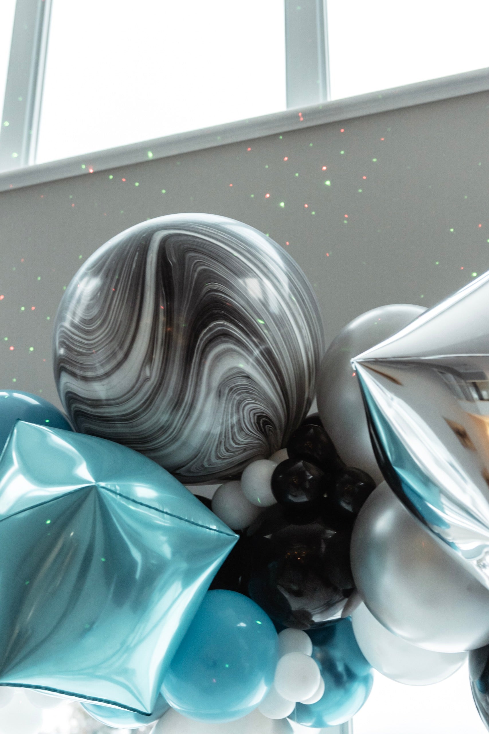• Longue guirlande de ballons en dégradé bleu, noir, argent et blanc, avec ballons suspendus simulant la neige qui tombe