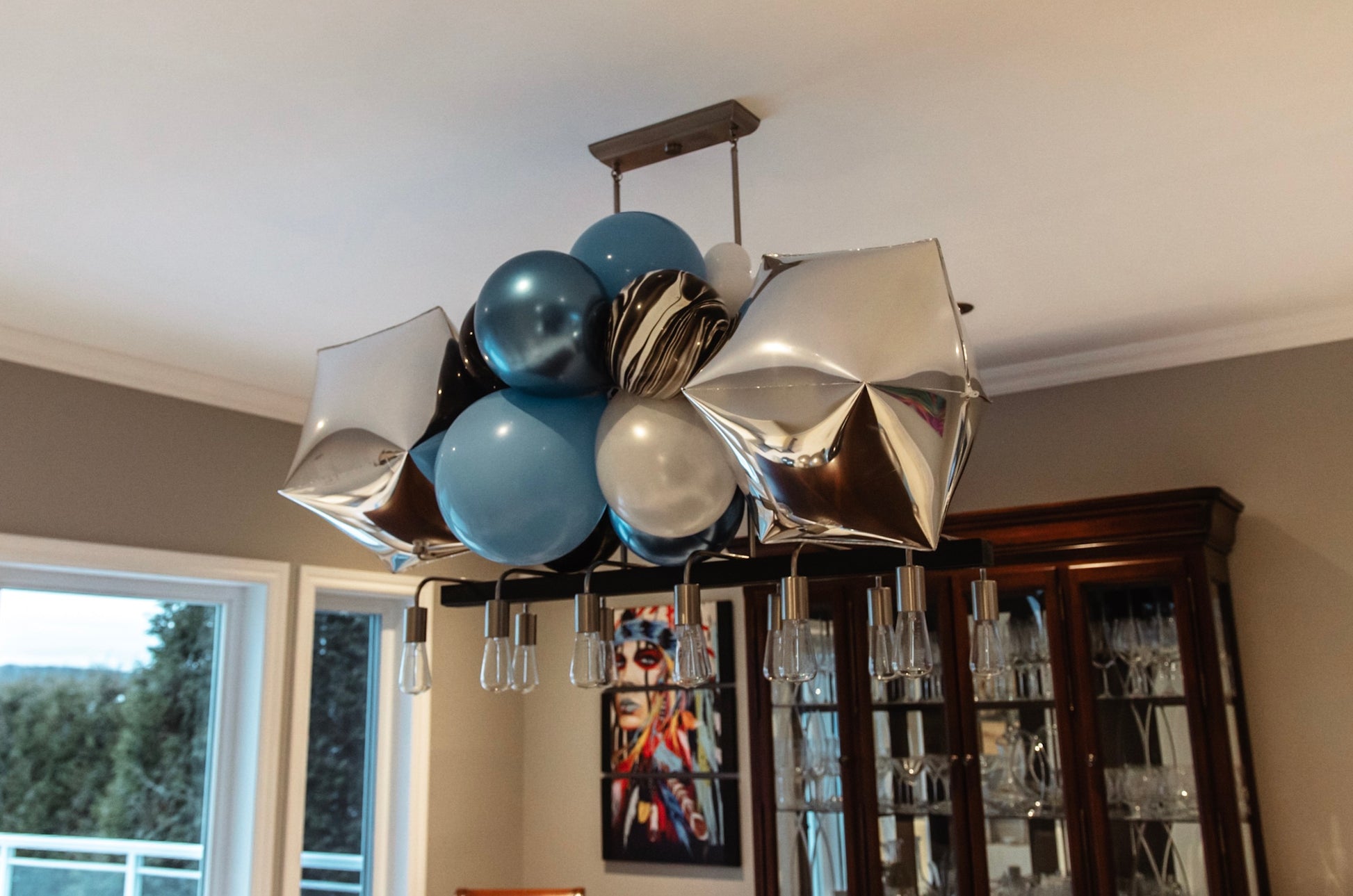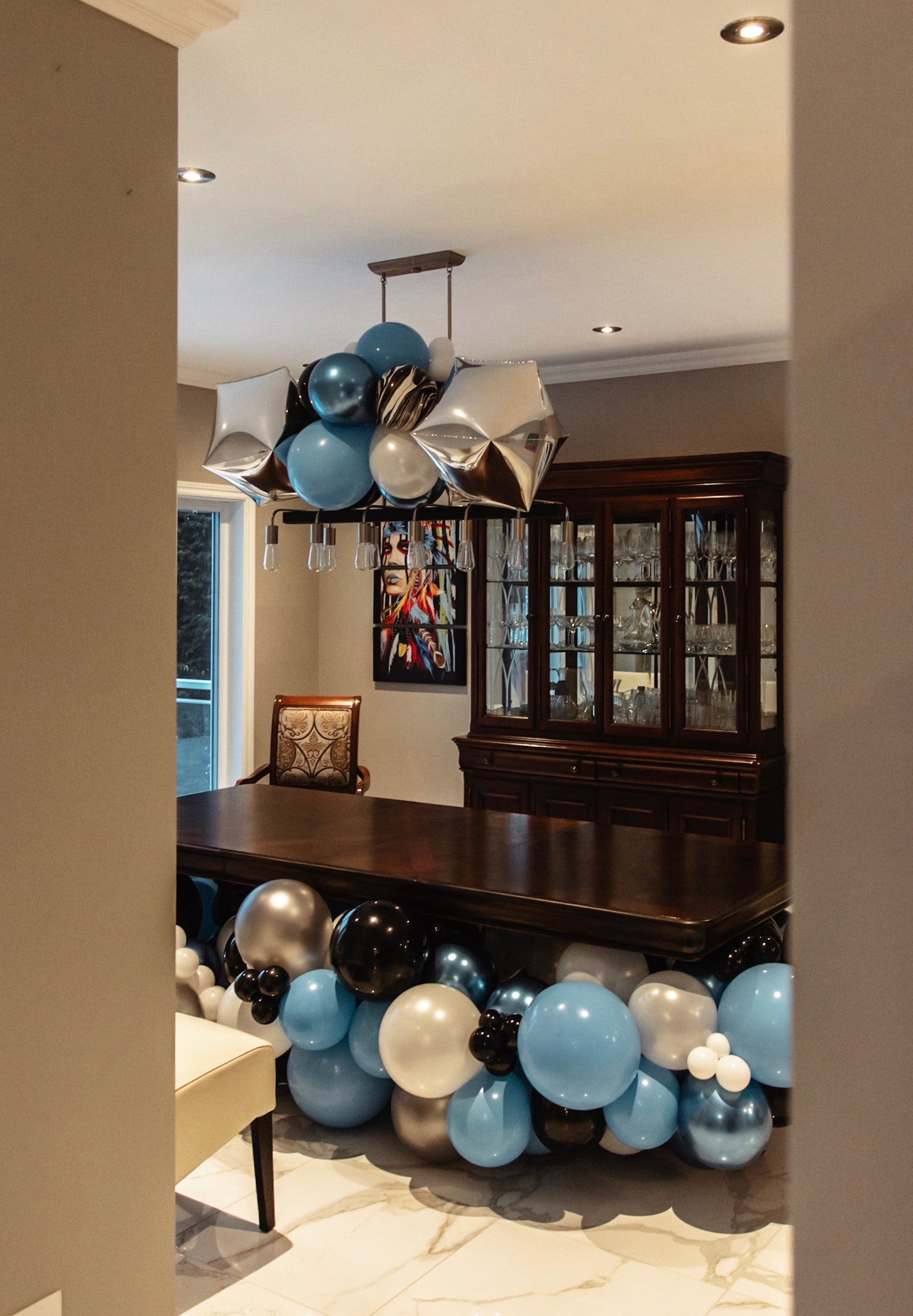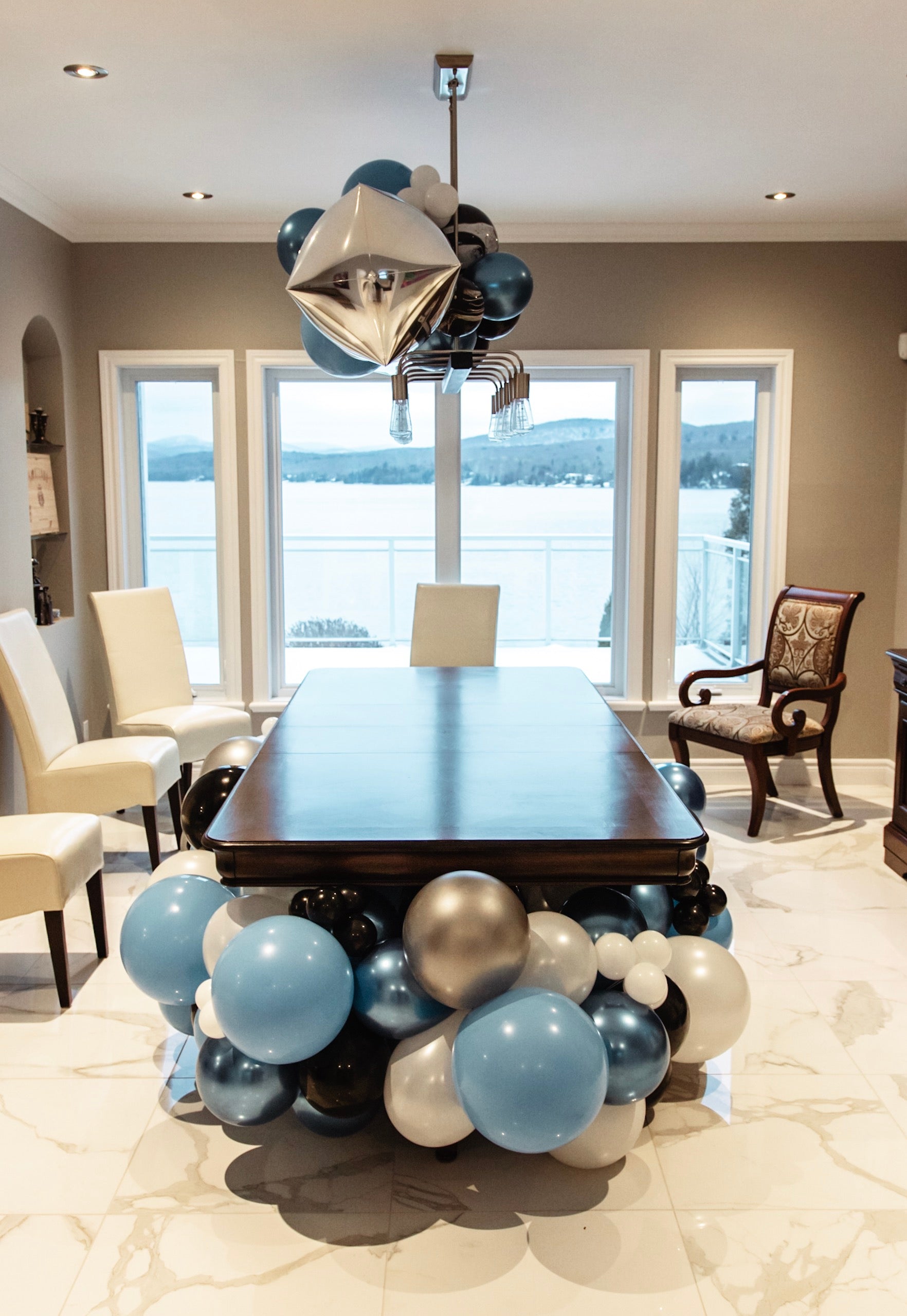 • Décoration de la table à manger et du luminaire avec des ballons pour une touche festive supplémentaire