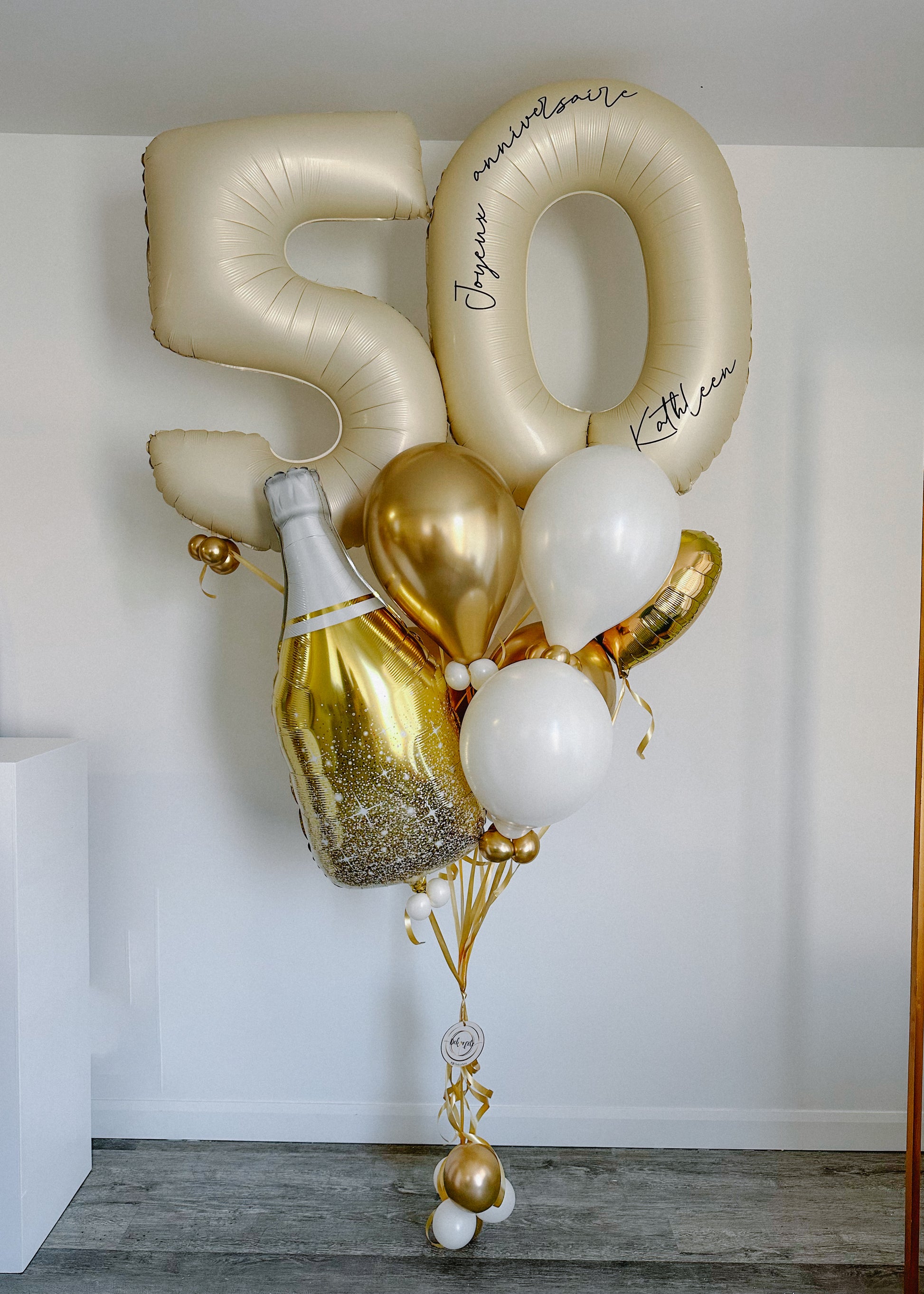 Comprends: 2 numéros 34'', 6 ballons latex 11'', 1 ballon coeur mylar 19'', 1 ballon bouteille de champagne et la personnalisation sur les numéros.