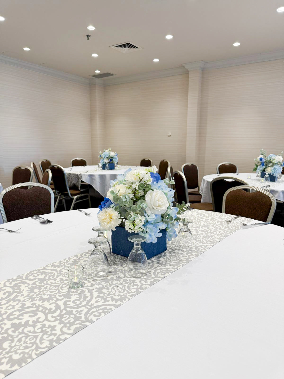 • Centres de table floraux permanents aux teintes bleu et blanc, présentés dans des vases recouverts de denim
