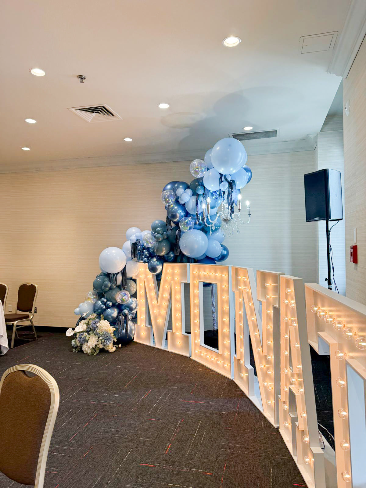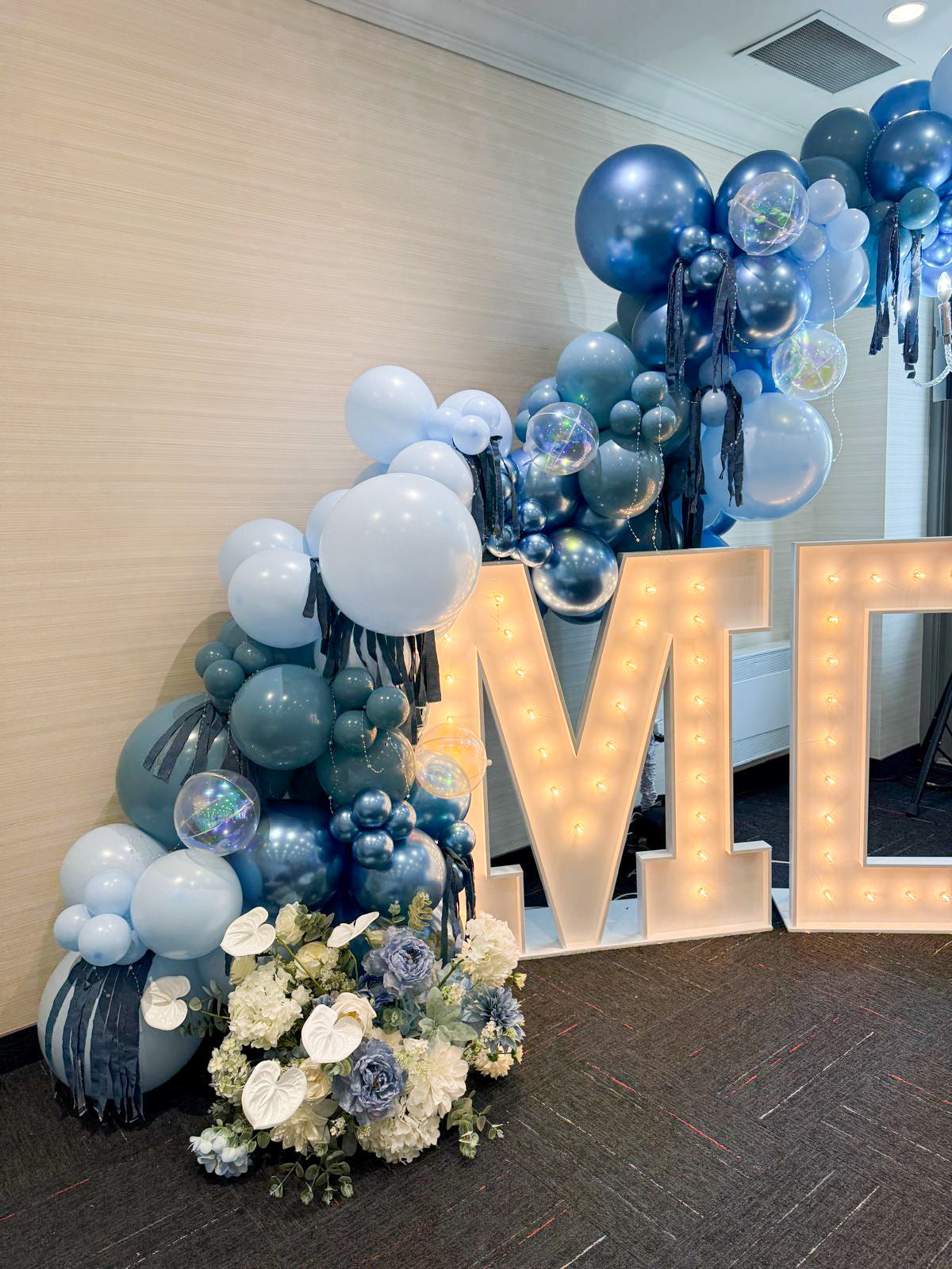 • Arche de ballons dans des tons bleu et argent avec accessoires en denim pour rappeler le thème