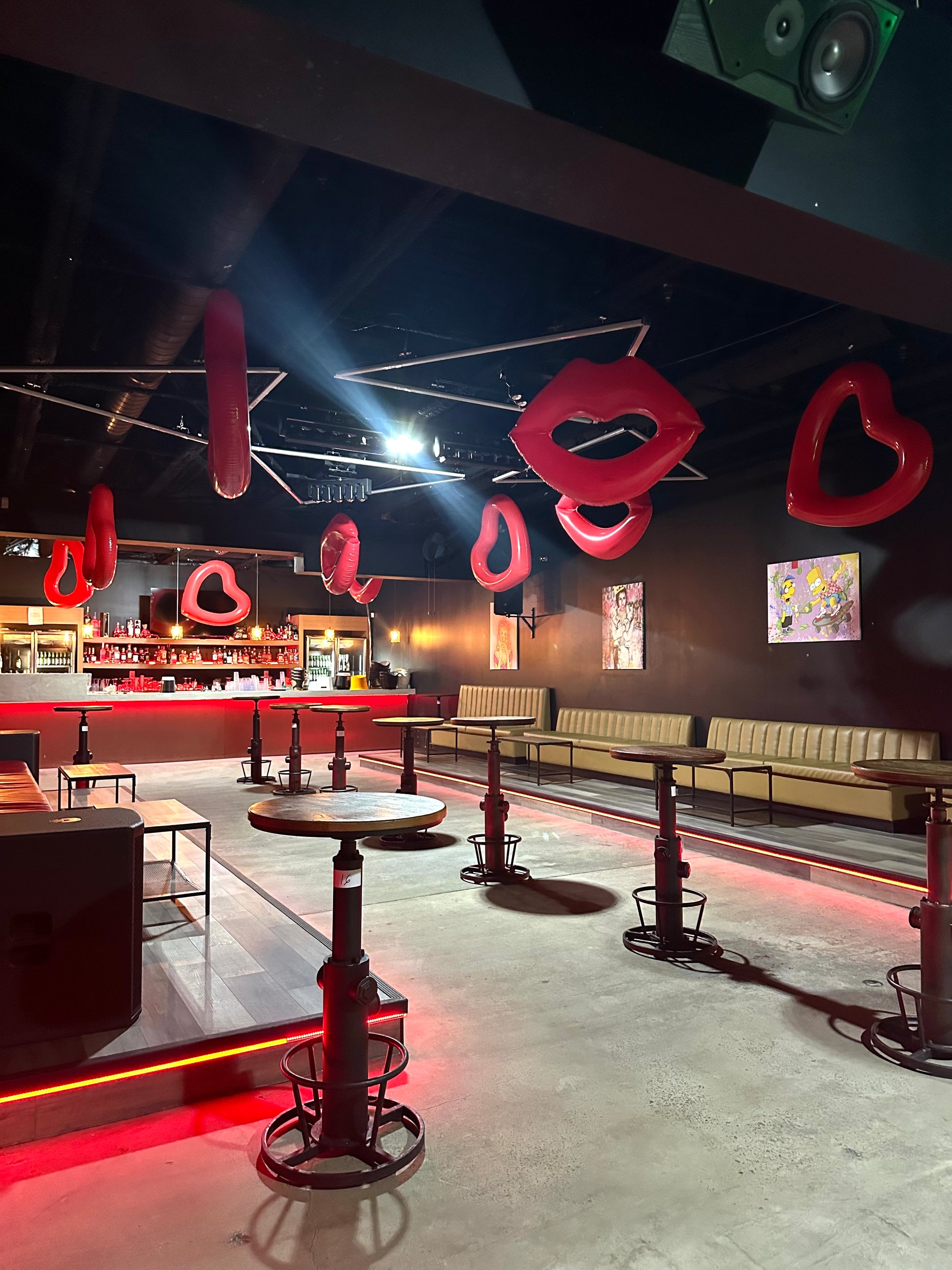 • Suspensions décoratives en forme de cœurs et de lèvres rouges au plafond, pour une ambiance glamour et immersive