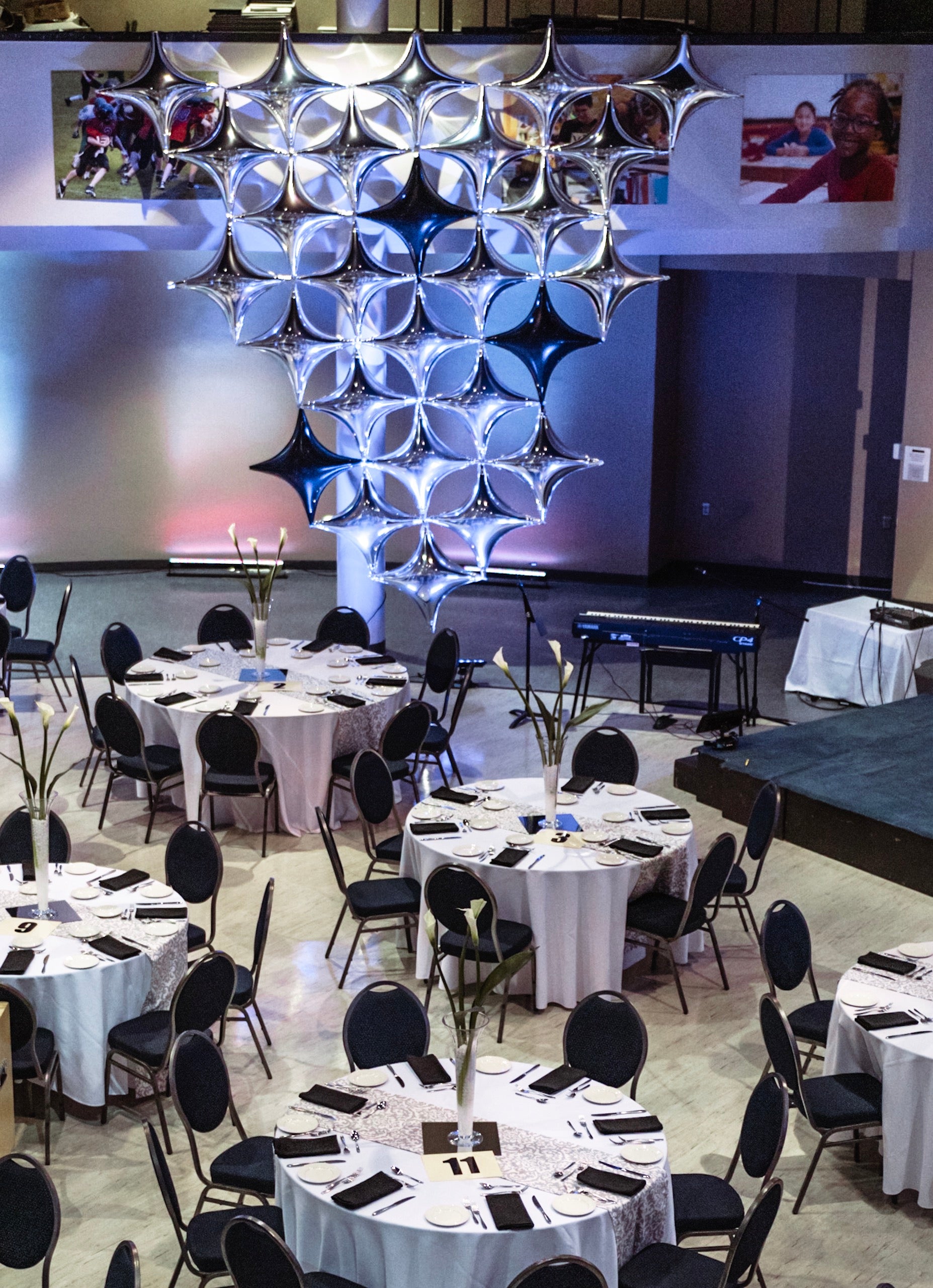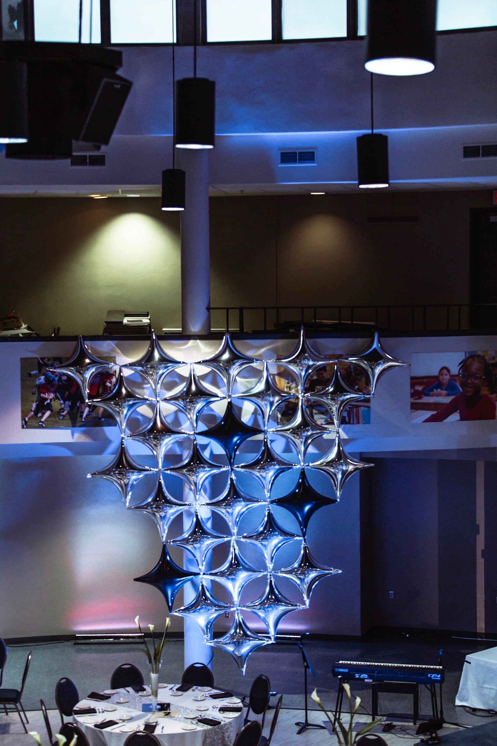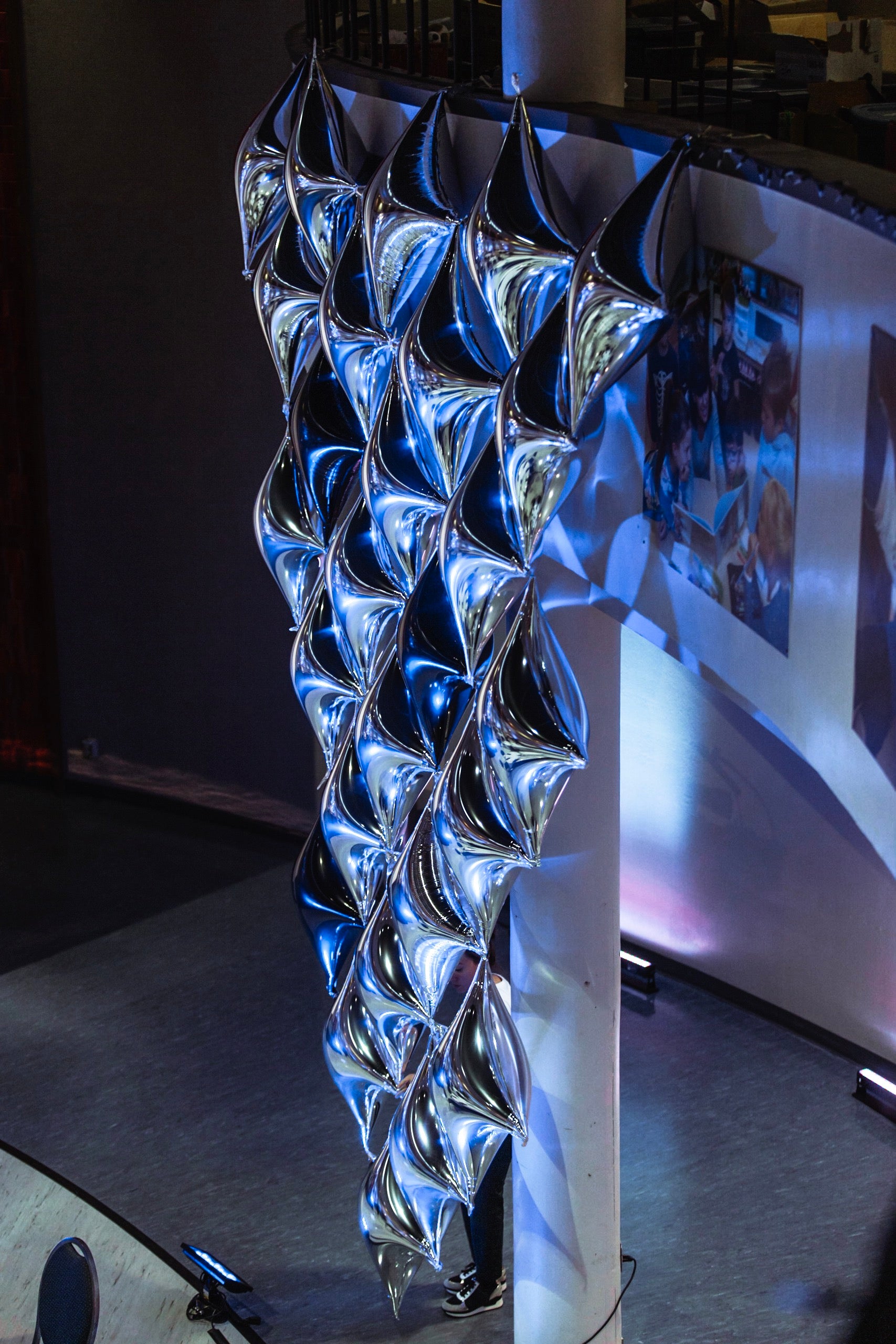 • Montage de ballons géants en forme d’étoiles tombant du deuxième étage, créant un effet visuel saisissant