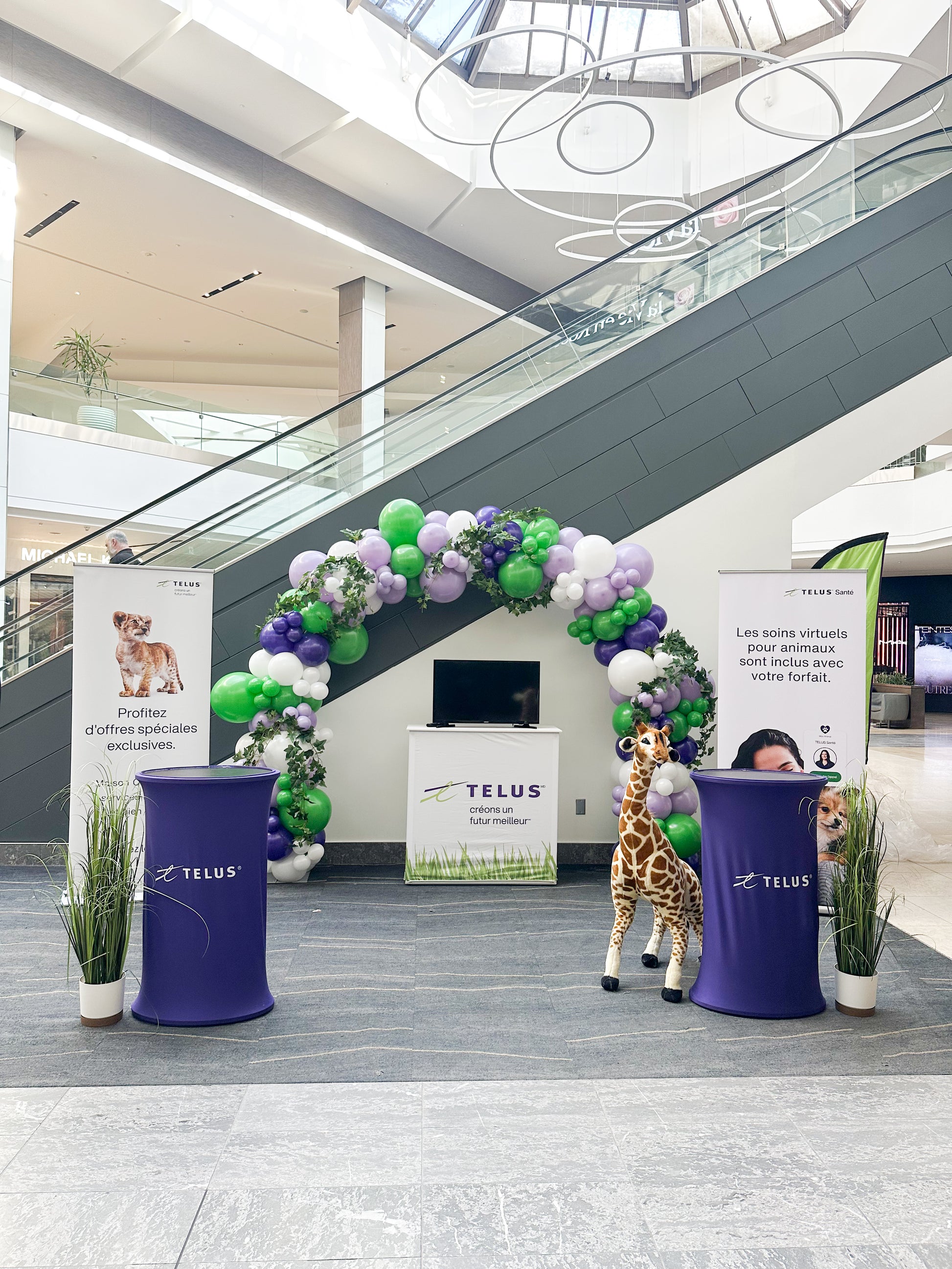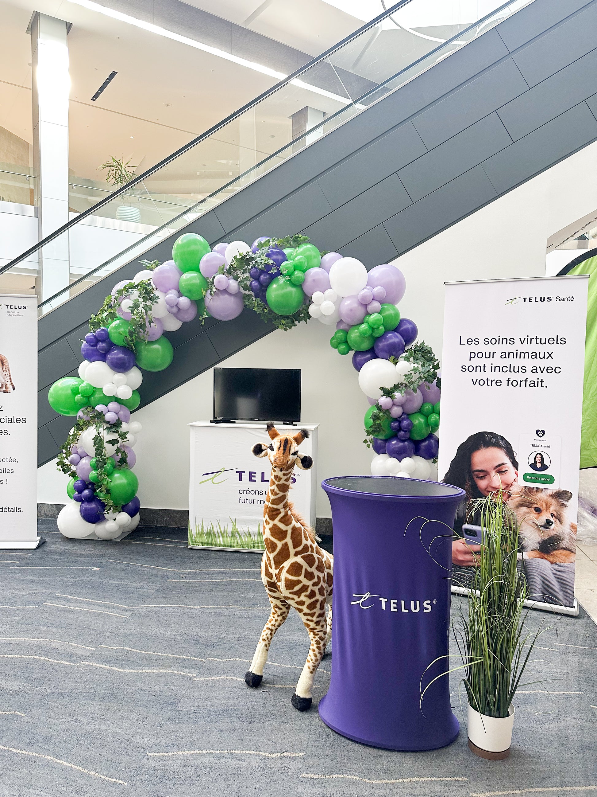 • Arche de ballons organique 8’x8’ aux couleurs de TELUS (vert, violet et blanc)