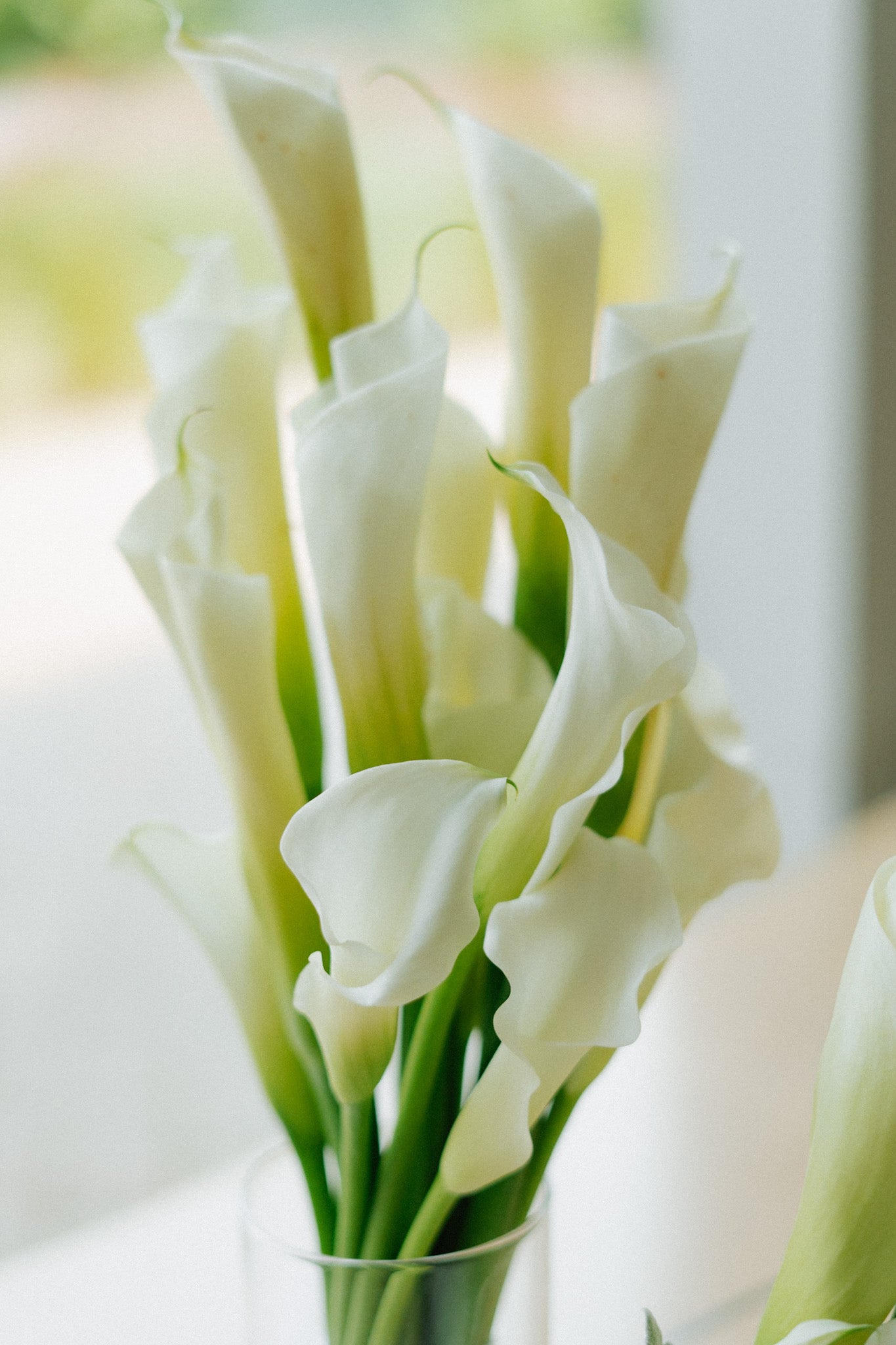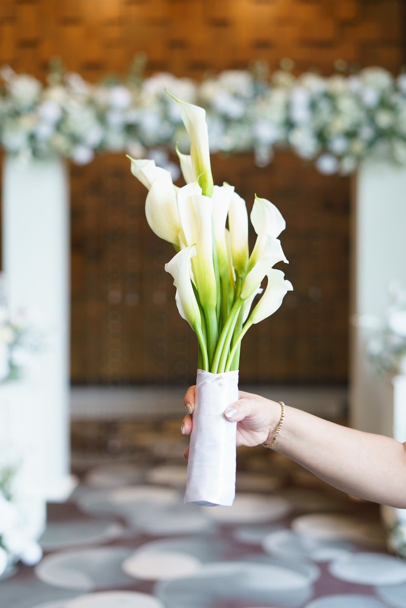 • Allée décorée de bouquets de fleurs blanches délicates (roses, lys calla, hortensias)